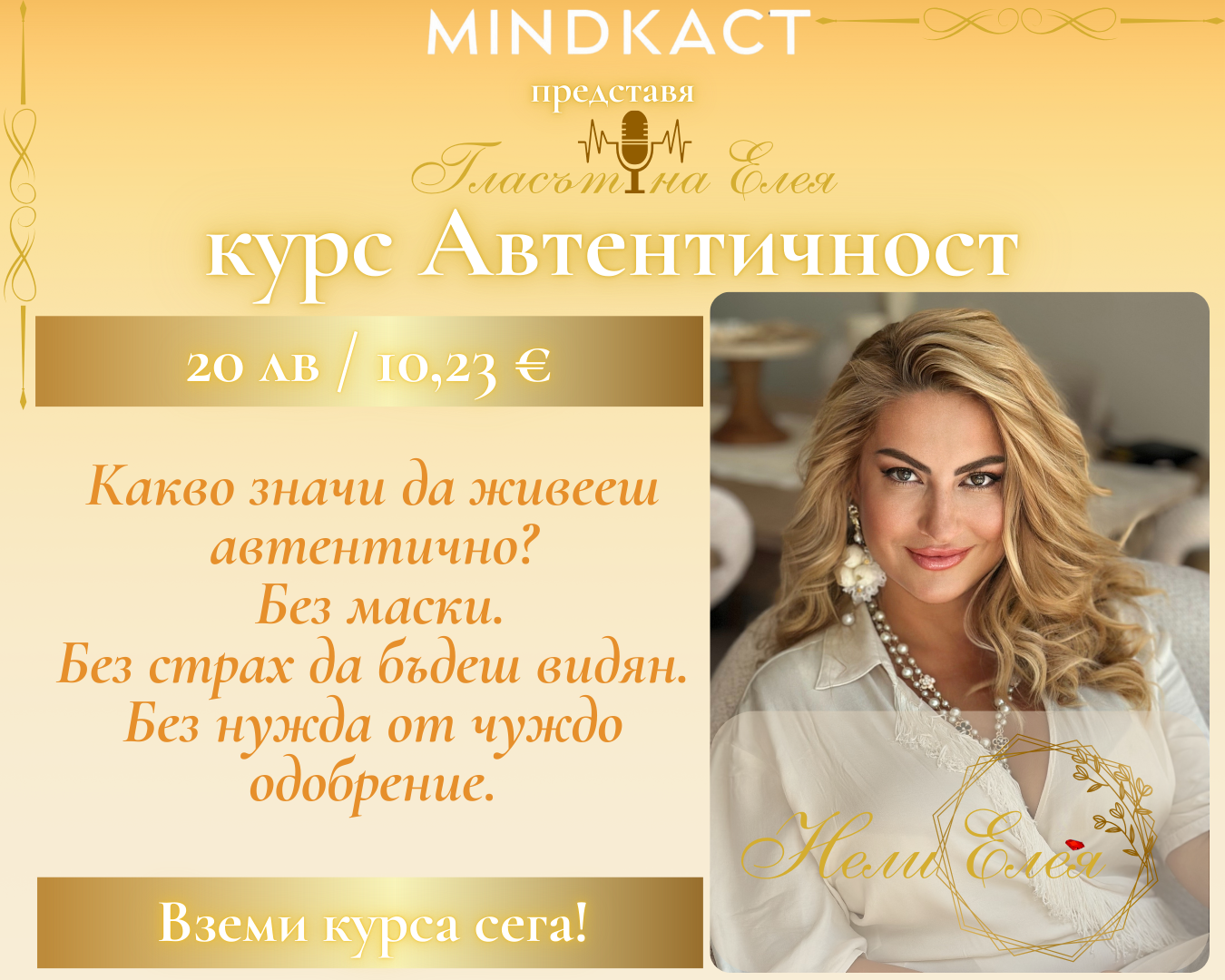 Курсът „Автентичност“ е специална среща с Нели Елея, посветена на онова дълбоко завръщане към Себе си – отвъд маските, страховете и стремежа към чуждо одобрение.